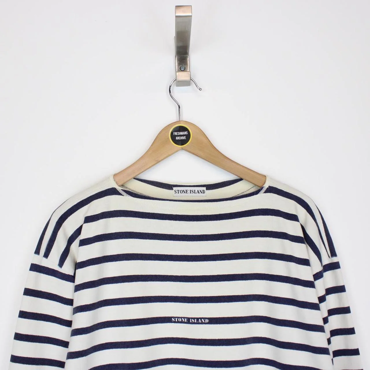 Vintage 80s Stone Island Cream and Navy Blue Striped Long Sleeve Spellout T-Shirt