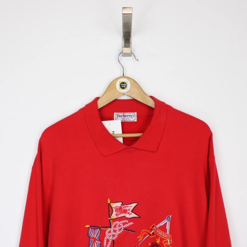 Vintage 90's Burberry Red Collared Neck Compass Spellout Sweatshirt Jumper Size on label: Small Our recommended size: Small Pit to pit (inches): 23.5 Length (inches): 27.5 All products listed are vintage unless stated otherwise in the description. These items are pre-loved and pre-worn, resulting in small signs of wear and minor fading. We think this adds to their unique authenticity, but if an item has any major flaws these will be stated below. Please contact us if you have any further questions!