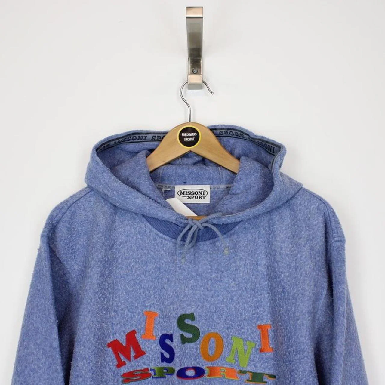 Vintage 90's Missoni Sport Blue and Multicoloured Pullover Spellout Fleece Hoodie Jumper