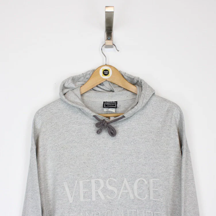 Vintage 90's Versace Jeans Couture Light Grey and White Pullover Spellout Hoodie Jumper Size on label: Medium Our recommended size: Medium Pit to pit (inches): 23 Length (inches): 30.5 All products listed are vintage unless stated otherwise in the description. These items are pre-loved and pre-worn, resulting in small signs of wear and minor fading. We think this adds to their unique authenticity, but if an item has any major flaws these will be stated below. Please contact us if you have any further questions!